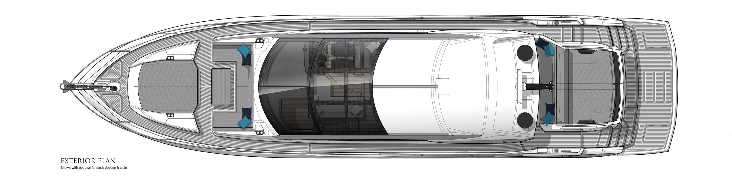 Aesthetic styling is prevalent in every detail. The yacht profile turns heads with stainless steel air intake cowlings and exterior handrails, contributing to the high-quality finish. There is an enhanced material selection, with new exterior upholstery and moulding options. Adventurous buyers will be captivated by a choice of four new grey hull colours. Overall, the exterior is aggressive and imposing, with a new, angular hull and superstructure glazing design.